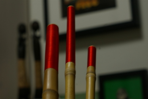 繋ぎの穴をあけて、印籠部分や穂先、持ち手を繋げていくわけです。