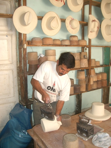 おじさんがアイロンで木型にはめ込む。