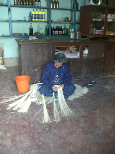おばちゃんが、わらを編んで