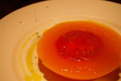 黄色いトマトのピューレを固めて、真っ赤なトマトと一緒に冷やしてみました。